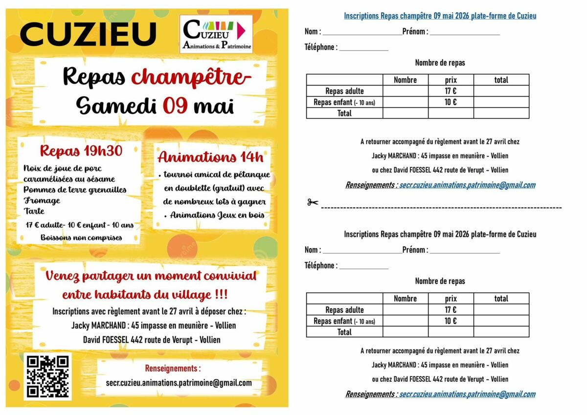 tournoi amical de pétanque et un repas champêtre le samedi 09 mai après-midi/soir (voir affiche en pièce jointe pour plus d'informations).