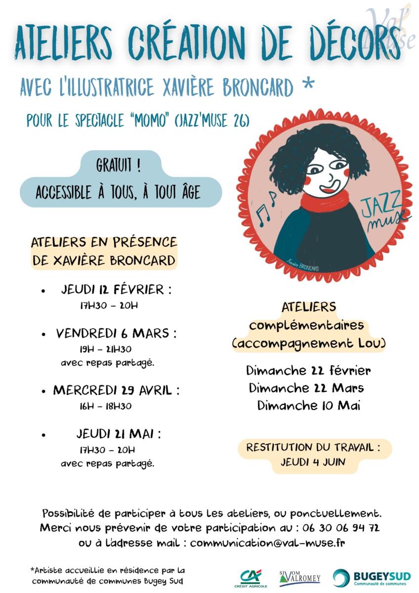 2. Ateliers de création de décors – Spectacle “Momo” : en partenariat avec l’association Val’Muse, ces ateliers participatifs permettront de réaliser les décors du spectacle musical Momo, présenté dans le cadre du festival Jazz’Muse.