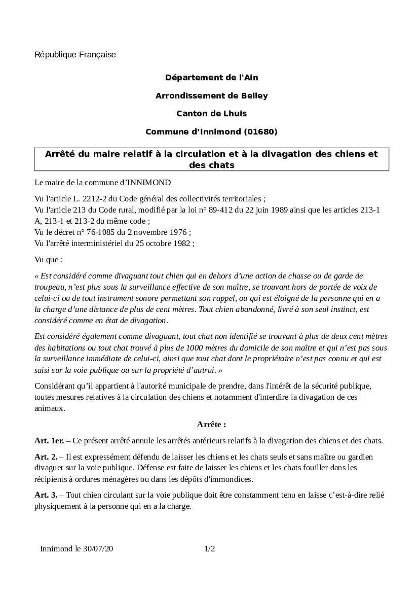 Suite à des évènements récents qui nous ont été signalés, nous vous rappelons que l'arrêté ci-joint du 30/07/20 relatif à l'interdiction de laisser errer vos animaux domestiques est toujours d'actualité.