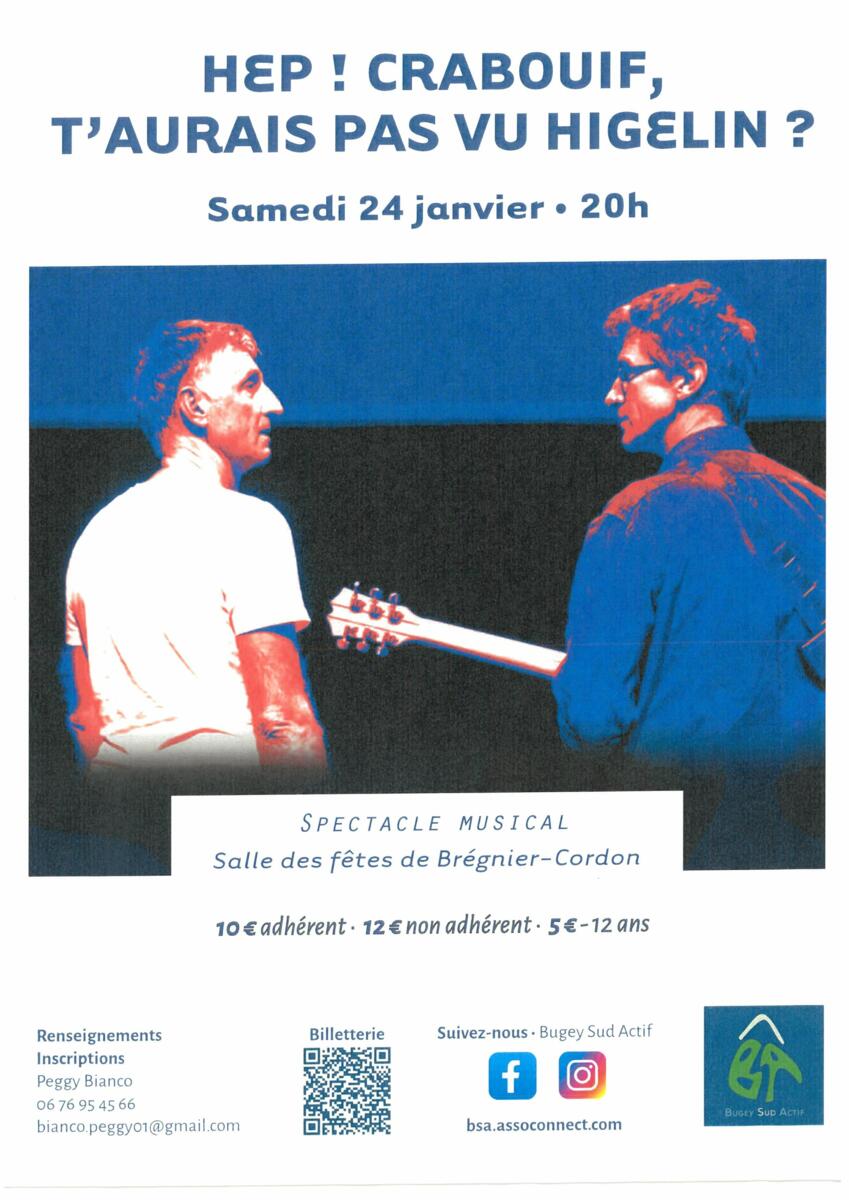 Un spectacle musical sera le samedi 24 janvier 2026 à 20h00 à la salle des fêtes de Brégnier-Cordon