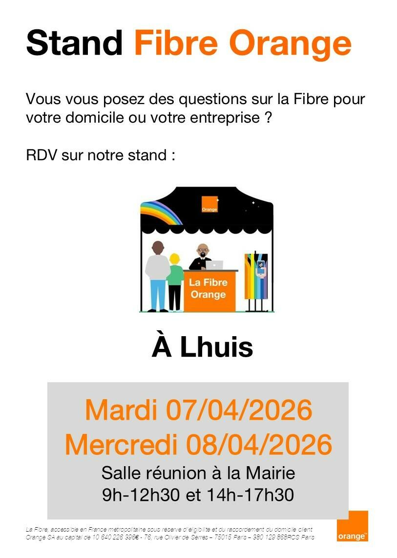 INFORMATIONS SUR LA FIBRE aujourd'hui et demain 07/04/2026 Un stand d'information sur la fibre organisé par Orange. Source : Mairie de Lhuis