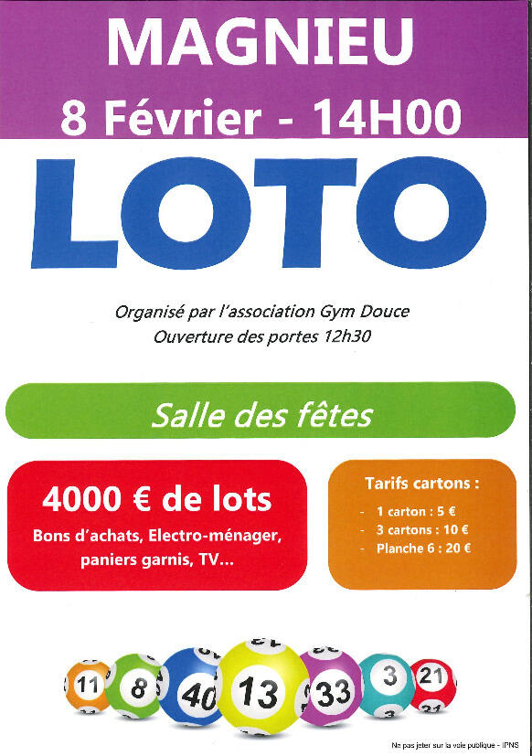 Loto organisé par la Gym Douce de Magnieu : le 08/02 à 14h00