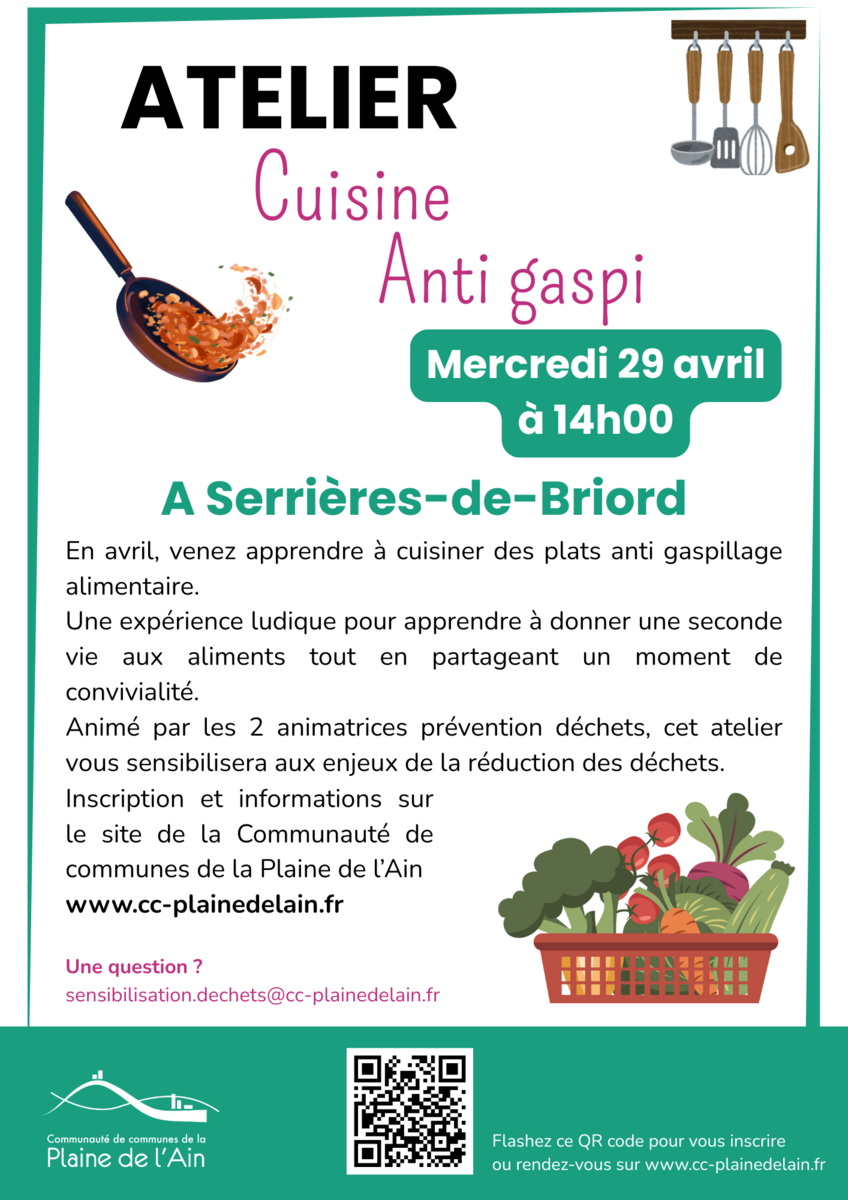 Le mercredi 29 avril 2026 à 14h un atelier Cuisine anti gaspillage alimentaire à Serrières-de-Briord, nombre de places limitées et date limite d’inscription le lundi 27 avril. Inscription via le lien https://forms.gle/G393KeDhsf7iALC56 ou en flashant le QR code sur l’affiche.