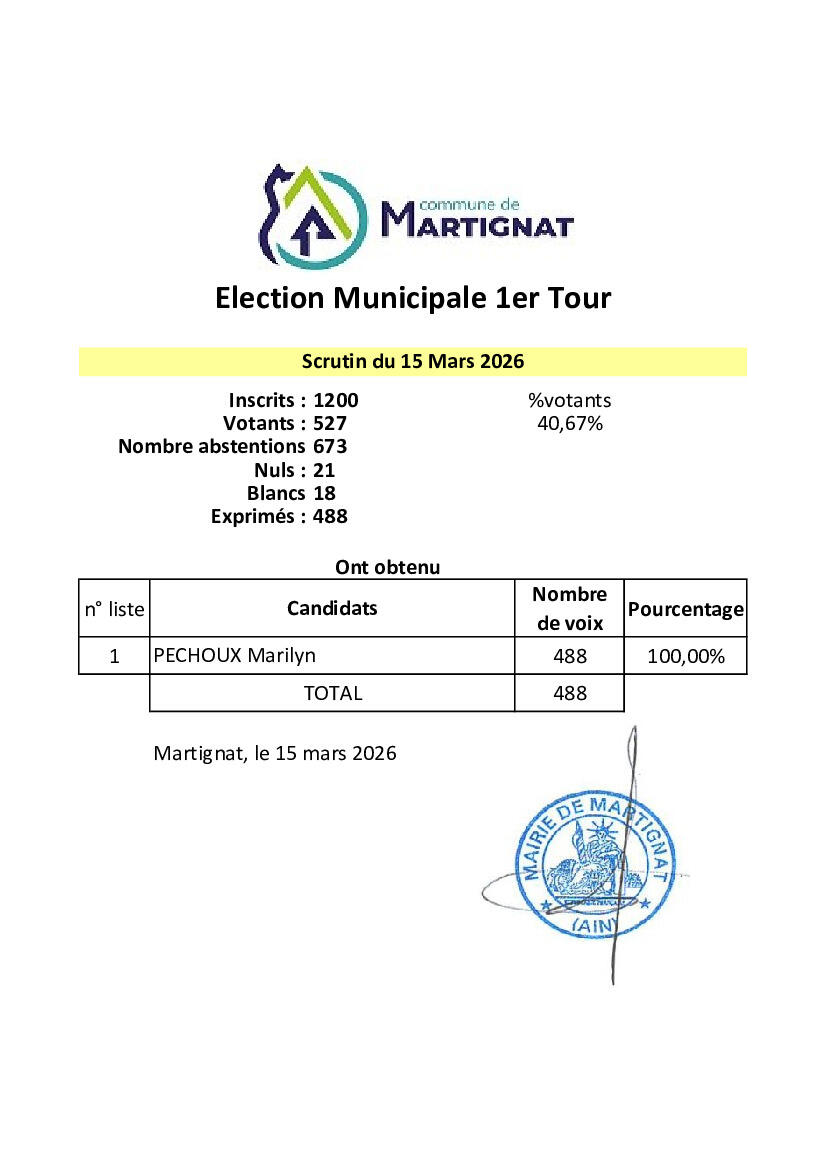 La liste "Martignat, notre commune, notre village" conduite par Marilyn PECHOUX est élue avec 488 voix au 1er tour :