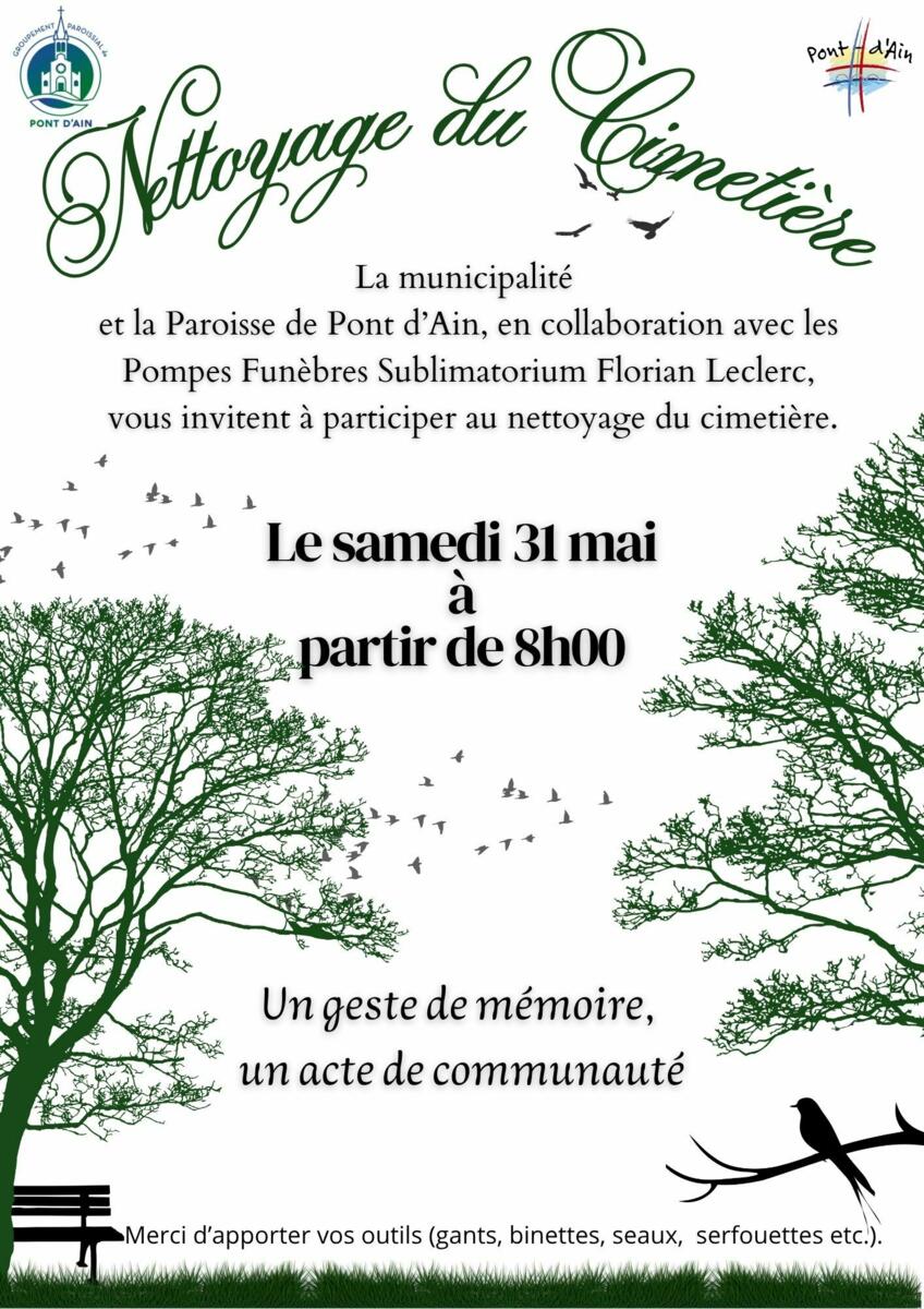 En collaboration avec la paroisse de Pont d'Ain et en présence du Sublimatorium de Pont d'Ain, la municipalité organise le samedi 3️⃣1️⃣ mai à partir de 8h le nettoyage du cimetière.