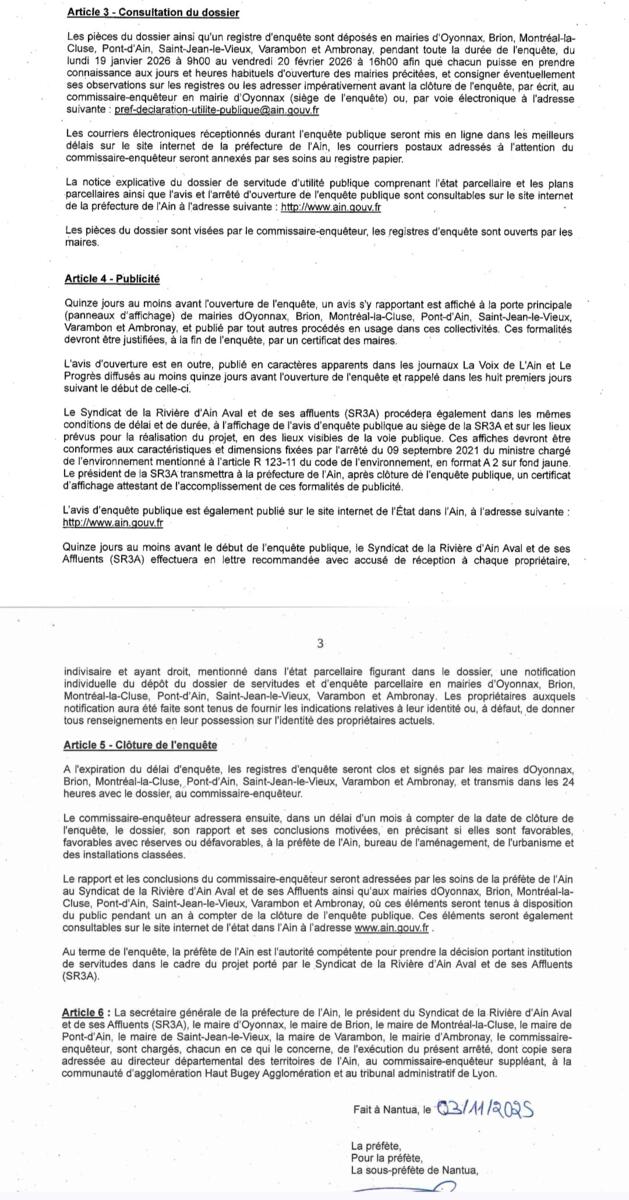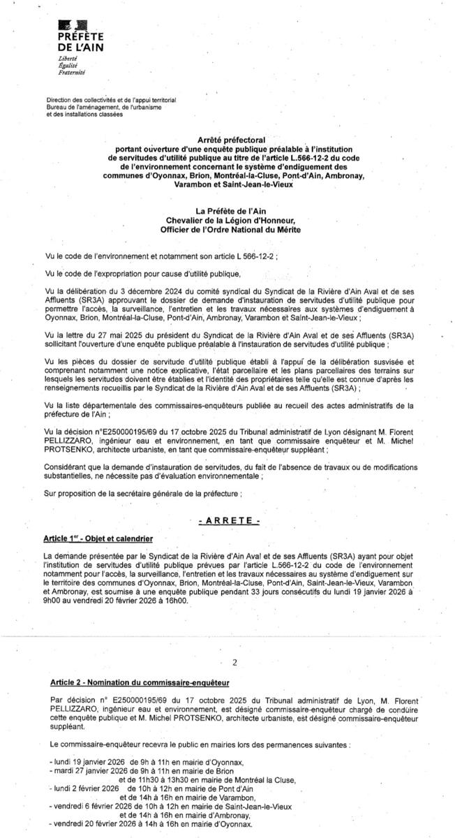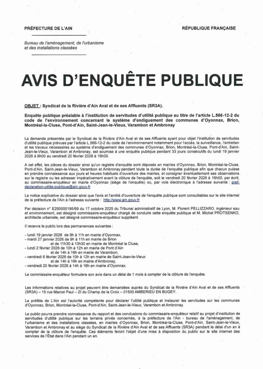 📌 Suite à l'enquête publique du SR3A - Syndicat de la Rivière d'Ain Aval et de ses Affluents, une permanence sera tenue à Pont d'Ain lundi 2 février 2026 de 10h à 12h en mairie.