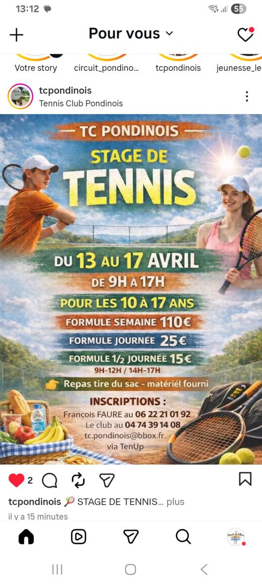 📌 Le Tennis Club Pondinois vous propose une semaine de stage de Tennis :