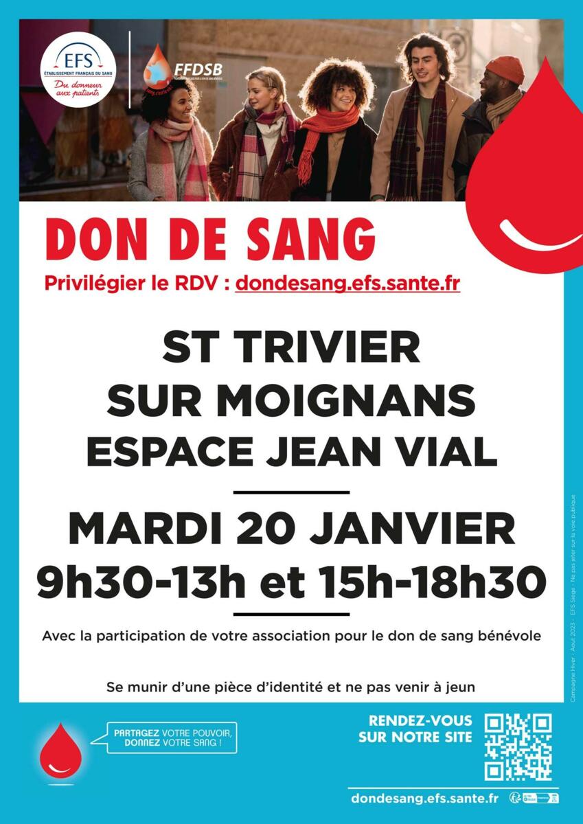 Notre prochaine collecte de sang est prévue le mardi 20 janvier de 9h30 à 13h00 et de 15h00 à 18h30, à l'espace Jean Vial à St Trivier sur Moignans.
