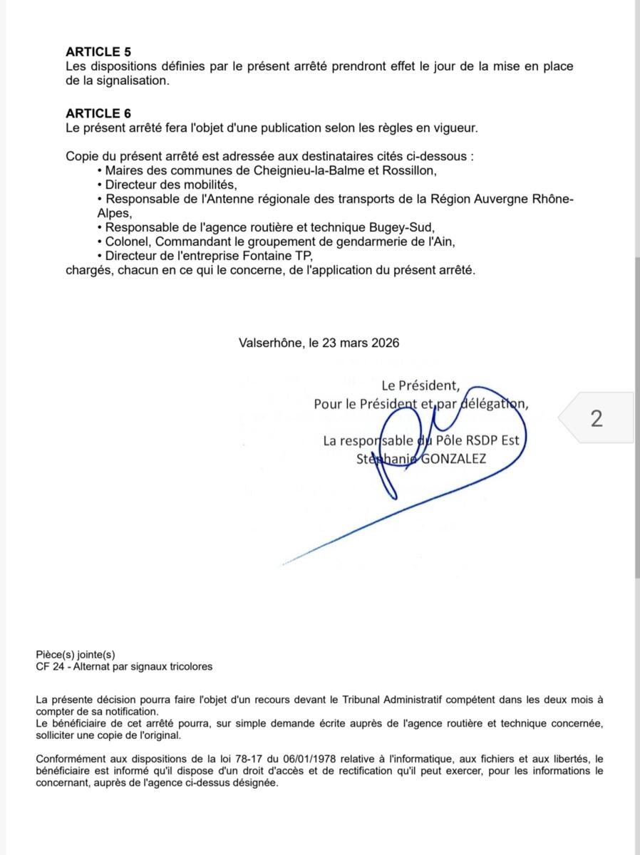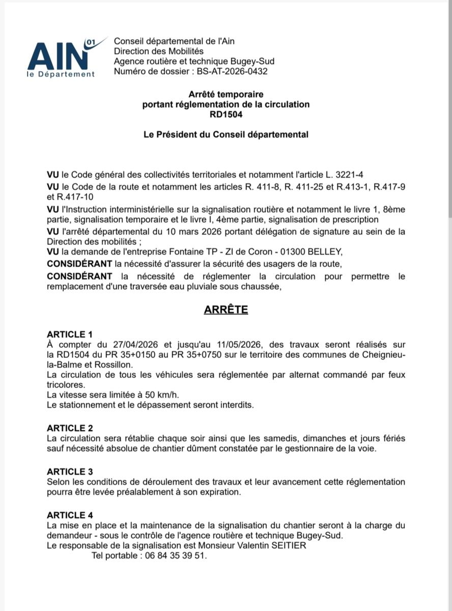 l’arrêté de circulation n° BS-AT-2026-0432 réglementant la circulation lors des travaux se déroulant le long de la RD1504, sur la commune de Cheignieu-la-Balme et Rossillon, pour la période du 27/04/2026 au 11/05/2026