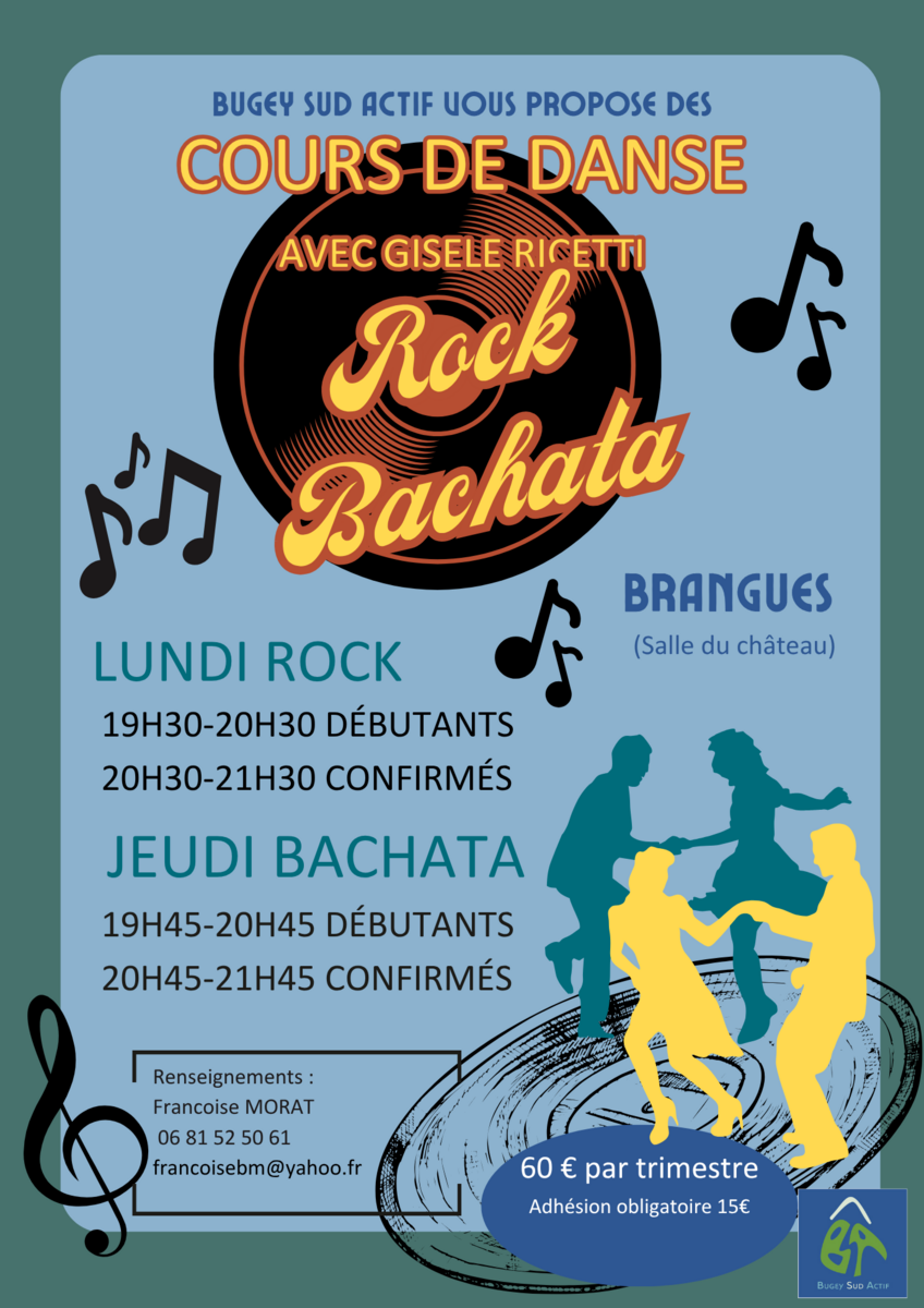 En ce début de second trimestre, pour répondre à la demande, nous mettons en place un cours de rock débutant, à partir du lundi 13 avril , à 20 h 30, contrairement à ce qui est indiqué sur l'affiche. Ce cours d'une heure aura lieu à la salle du château à Brangues.
