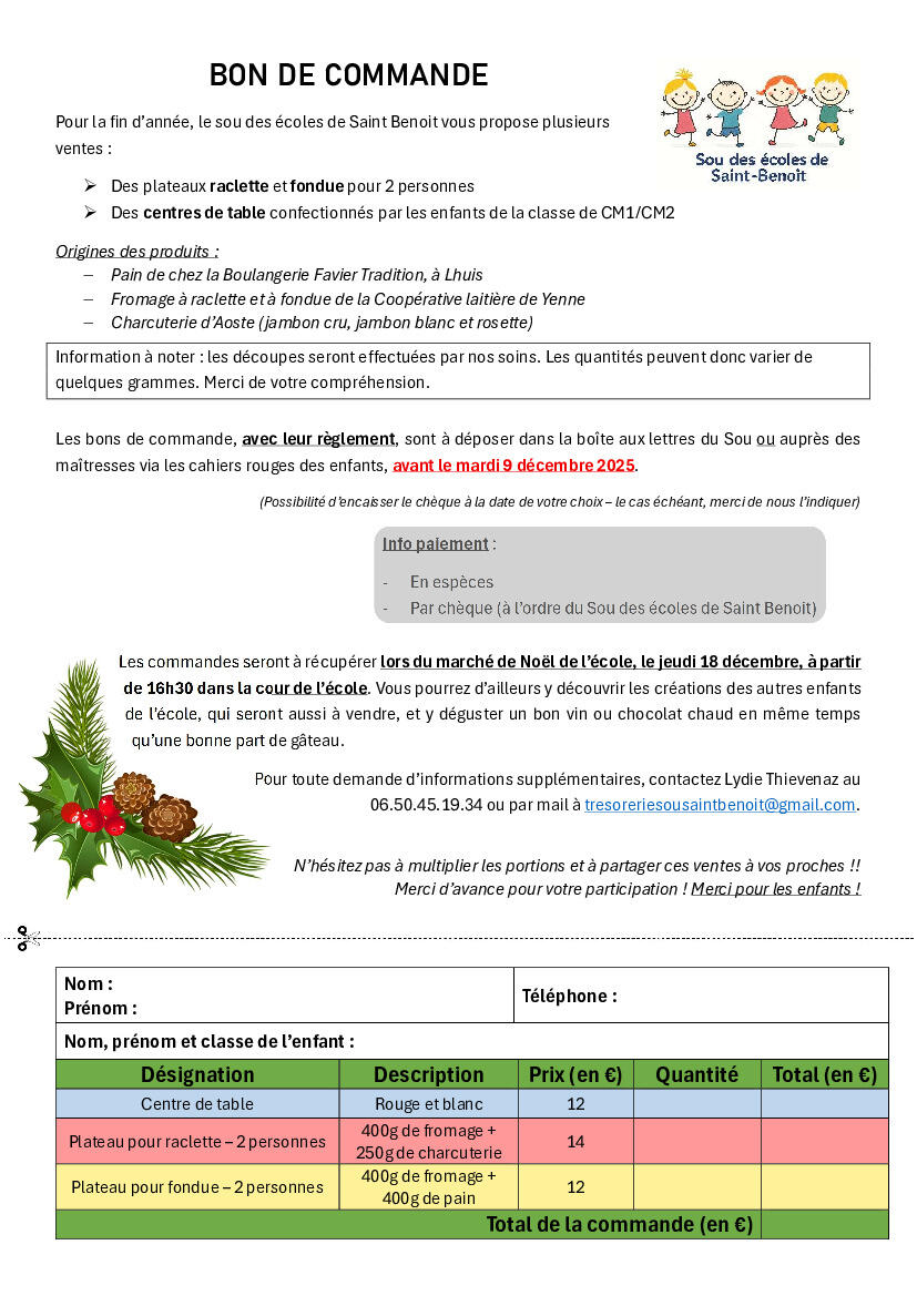 Le Sou des écoles de Saint Benoît organise sa traditionnelle vente de centres de table, ainsi qu'une vente de plateaux raclette et fondue pour 2 personnes.