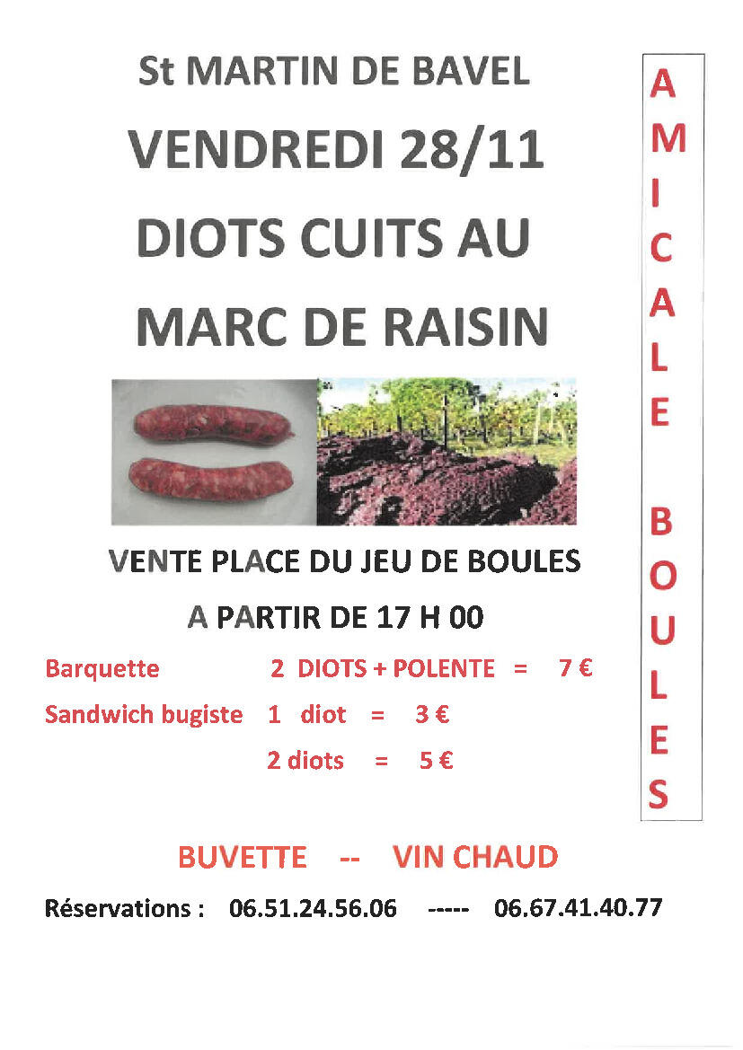 Vendredi 28 novembre Vente de diots cuits au marc de raisin