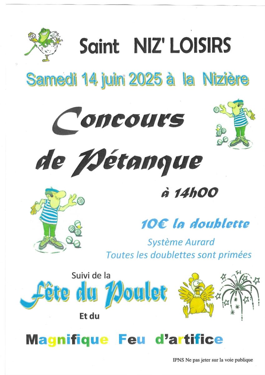 CONCOURS DE PETANQUE 14 juin 2025 SAINT NIZ'LOISIRS 20/05/2025 Concours de pétanque 14 juin 2025 SAINT NIZ'LOISIRS à 14 h 00