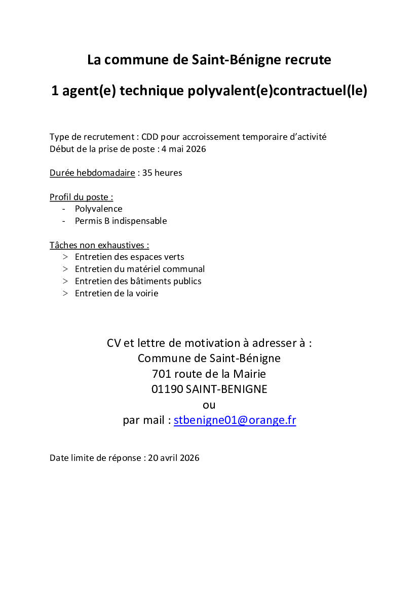 La Commune de St Bénigne recrute
