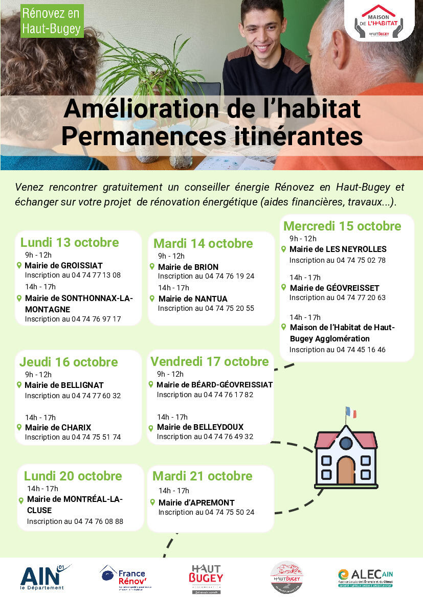 Du 13 au 21 octobre prochain, la Maison de l’Habitat propose aux habitants de Haut Bugey Agglomération des rendez-vous gratuits sur l’amélioration de l’habitat en mairie et la commune de Sonthonnax-la-Montagne participe à cet évènement.