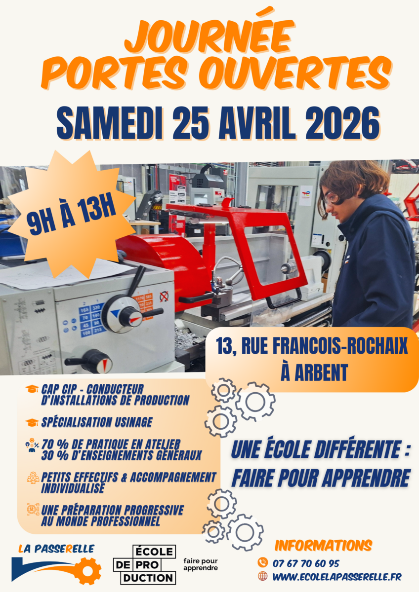 Journee Portes Ouvertes Ecole La Passerelle 17/04/2026 Journée portes ouvertes de l’Ecole de Production La Passerelle Samedi 25 avril 9h-13h Une école différente : faire pour apprendre 07 67 70 60 95 www.ecolelapasserelle.fr