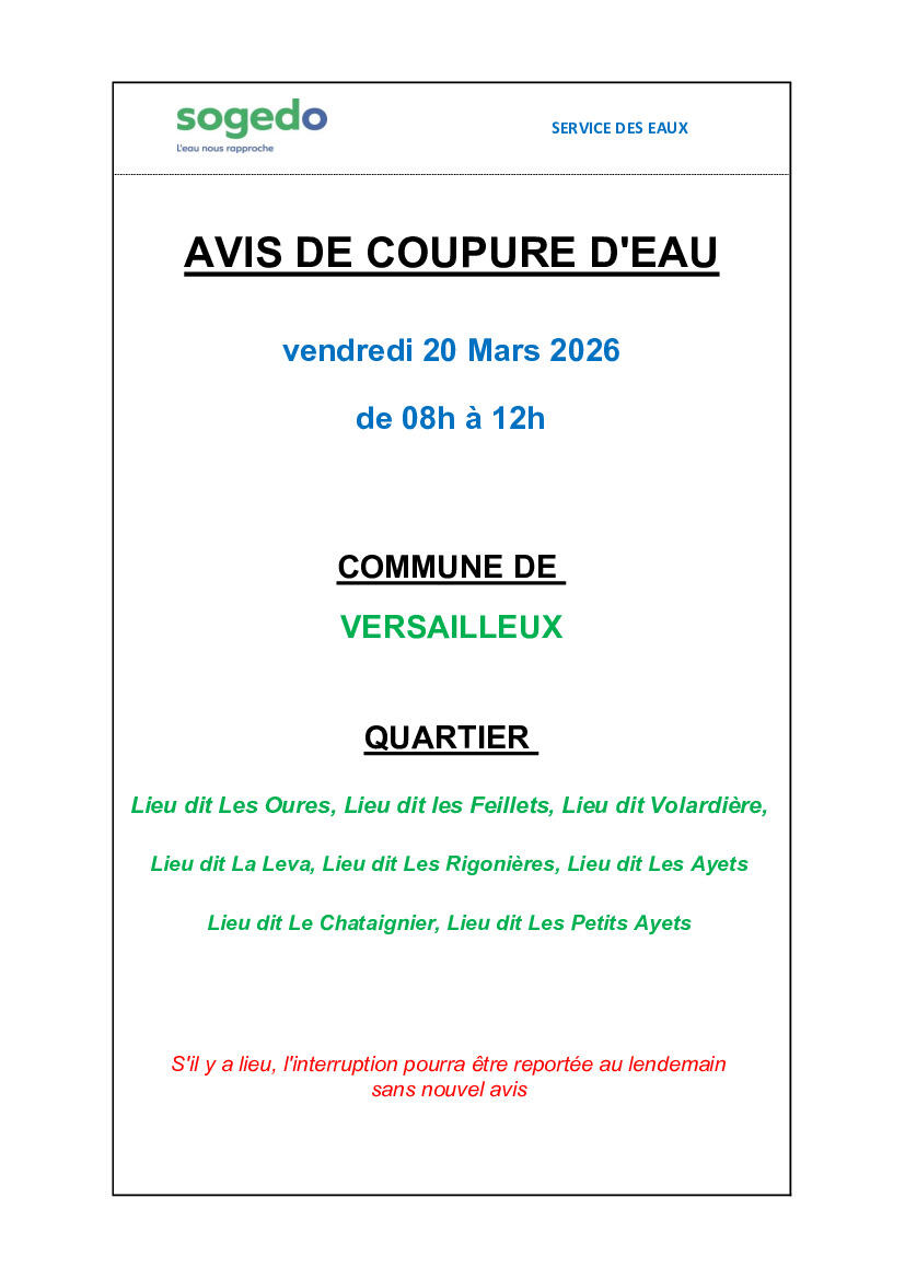 VERSAILLEUX- COUPURE EAU LE 20/03/2026