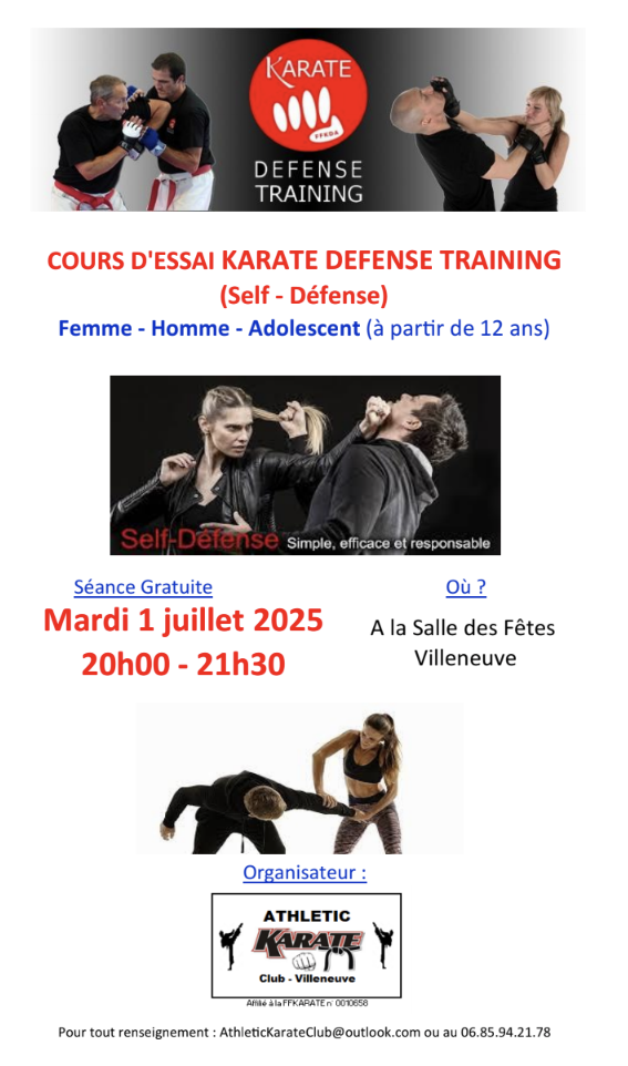 ATHLETIC KARATE CLUB 28/06/2025 Cours d'essai gratuit de Self Défense le Mardi 1er juillet Source : Mairie de Villeneuve