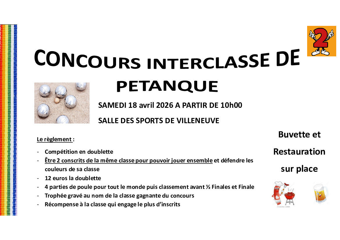 La classe en 2 organise le concours de pétanque interclasses samedi 18 Avril 2026 à partir de 10h00 à la salle des sports.