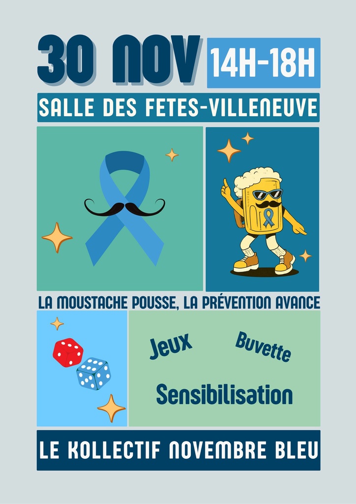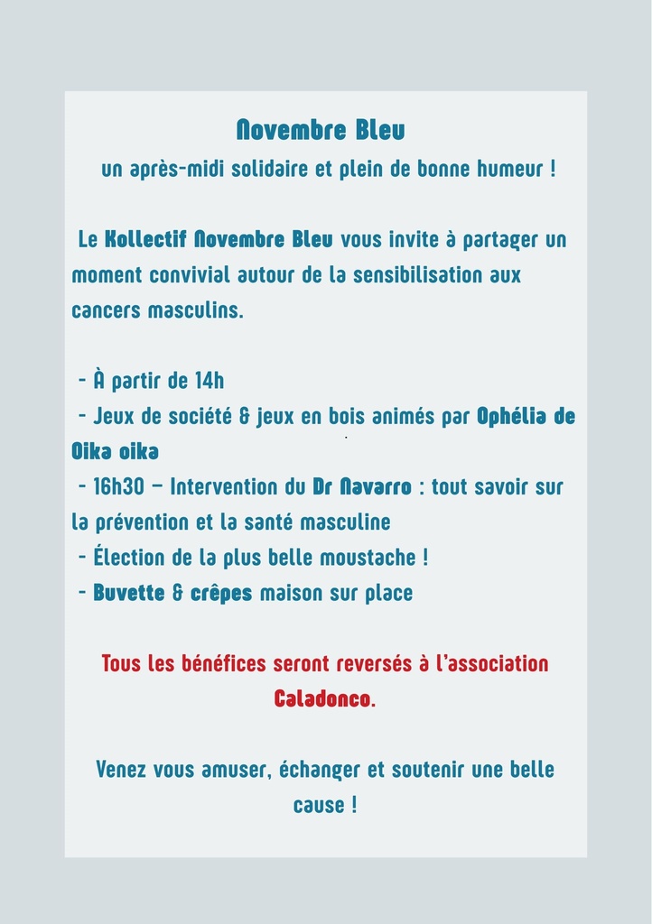 Le Kollectif NOVEMBRE BLEU se mobilise pour la santé des hommes et vous invite à partager un moment convivial autour de la sensibilisation des cancers masculins à savoir le cancer de la prostate et le cancer du testicule.