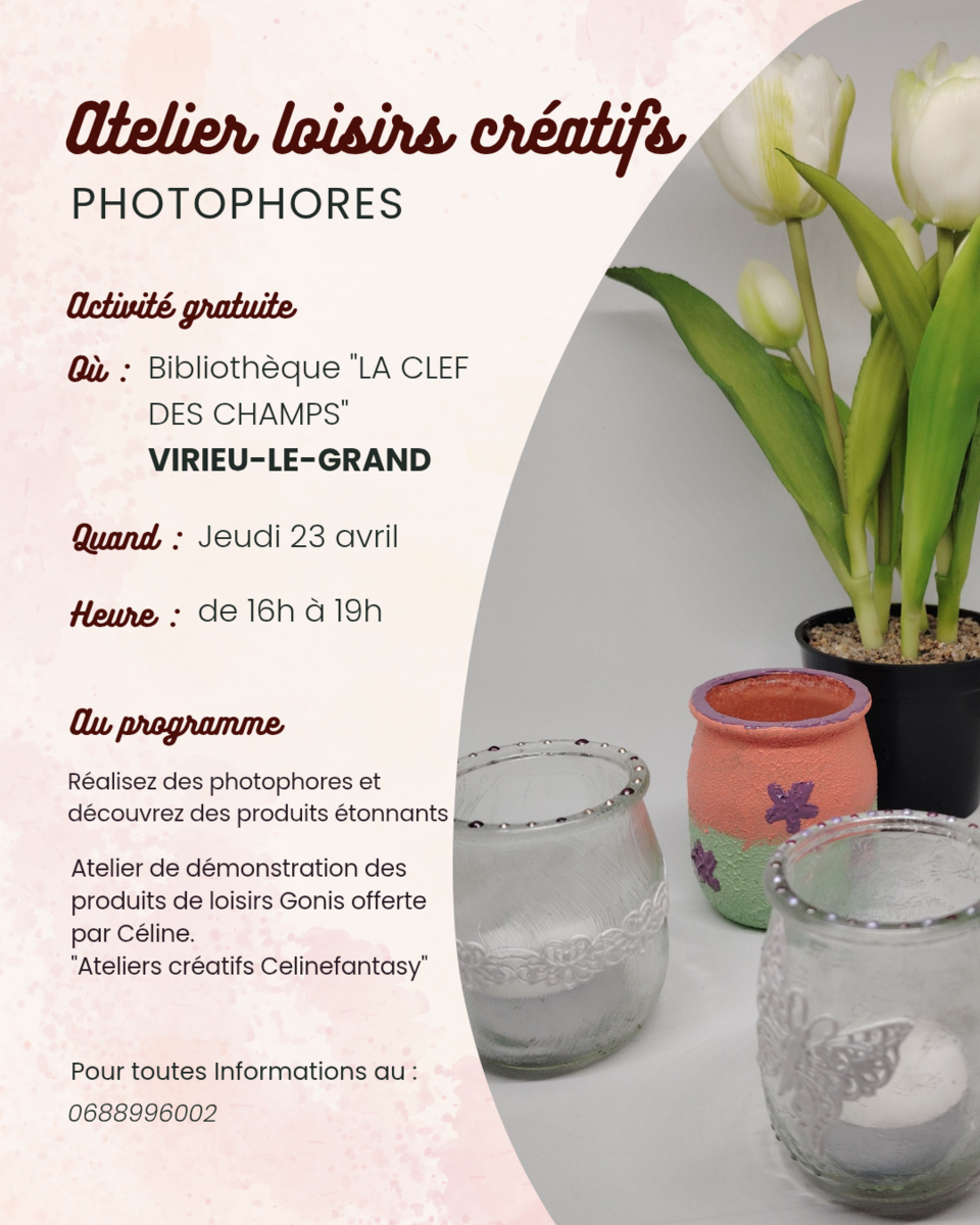 Atelier Loisirs créatifs à la Bibliothèque de Virieu le Gd 22/04/2026 Jeudi 23/04/2026 de 16h à 19h Atelier loisirs créatifs de 16h à 19h