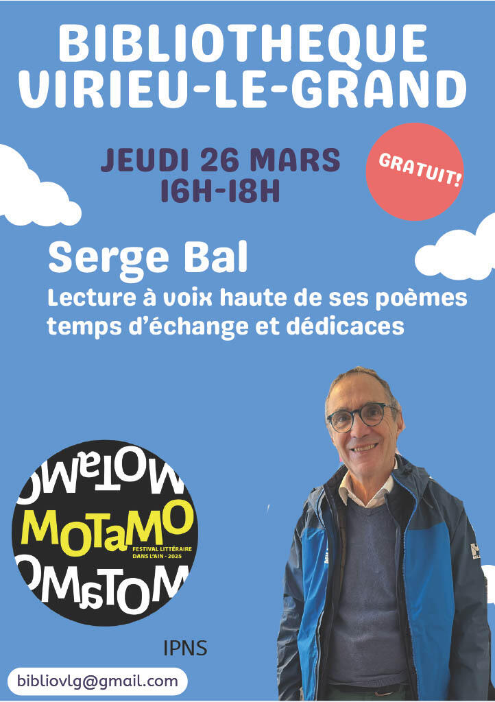 Serge BAL lit ses poèmes à voix haute à la bibliothèque municipale de Virieu le Grand le jeudi 26 mars 2026 de 16h à 18h.