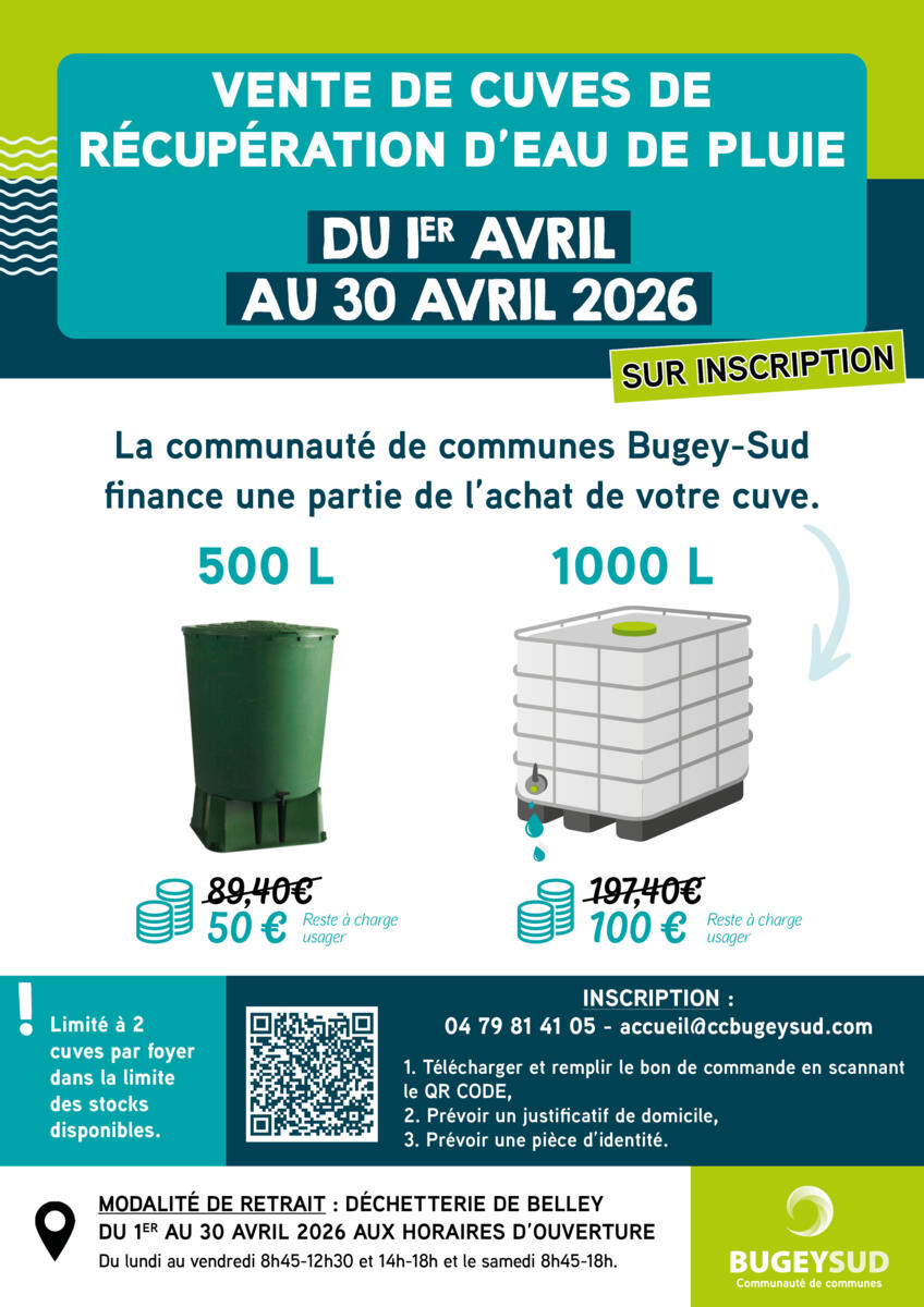 Le bon de commande est accessible via le QR code présent sur l’affiche ou directement sur notre site internet : https://ccbugeysud.com/actualites/vente-de-cuves-de-recuperation-deau-de-pluie-au-mois-davril-2026/