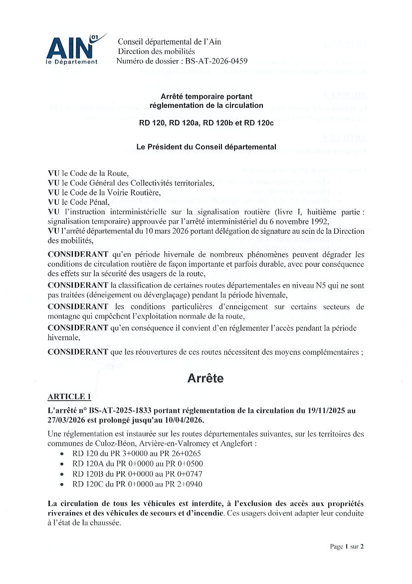 Arrêté de circulation - Col du Colombier Prolongation