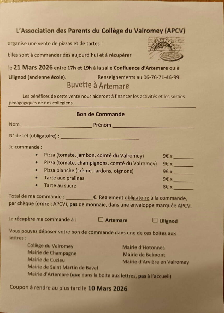 Votre mairie / Actualités / Vente de pizzas et de tartes - APCV du Collège d'Artemare