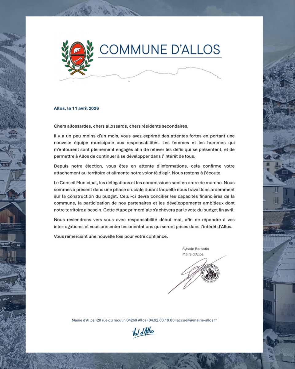 La municipalité s’adresse aujourd’hui aux administrés d’Allos à travers une lettre ouverte. Un point d’étape, en toute transparence, sur le travail engagé depuis les élections et sur les prochaines échéances importantes.