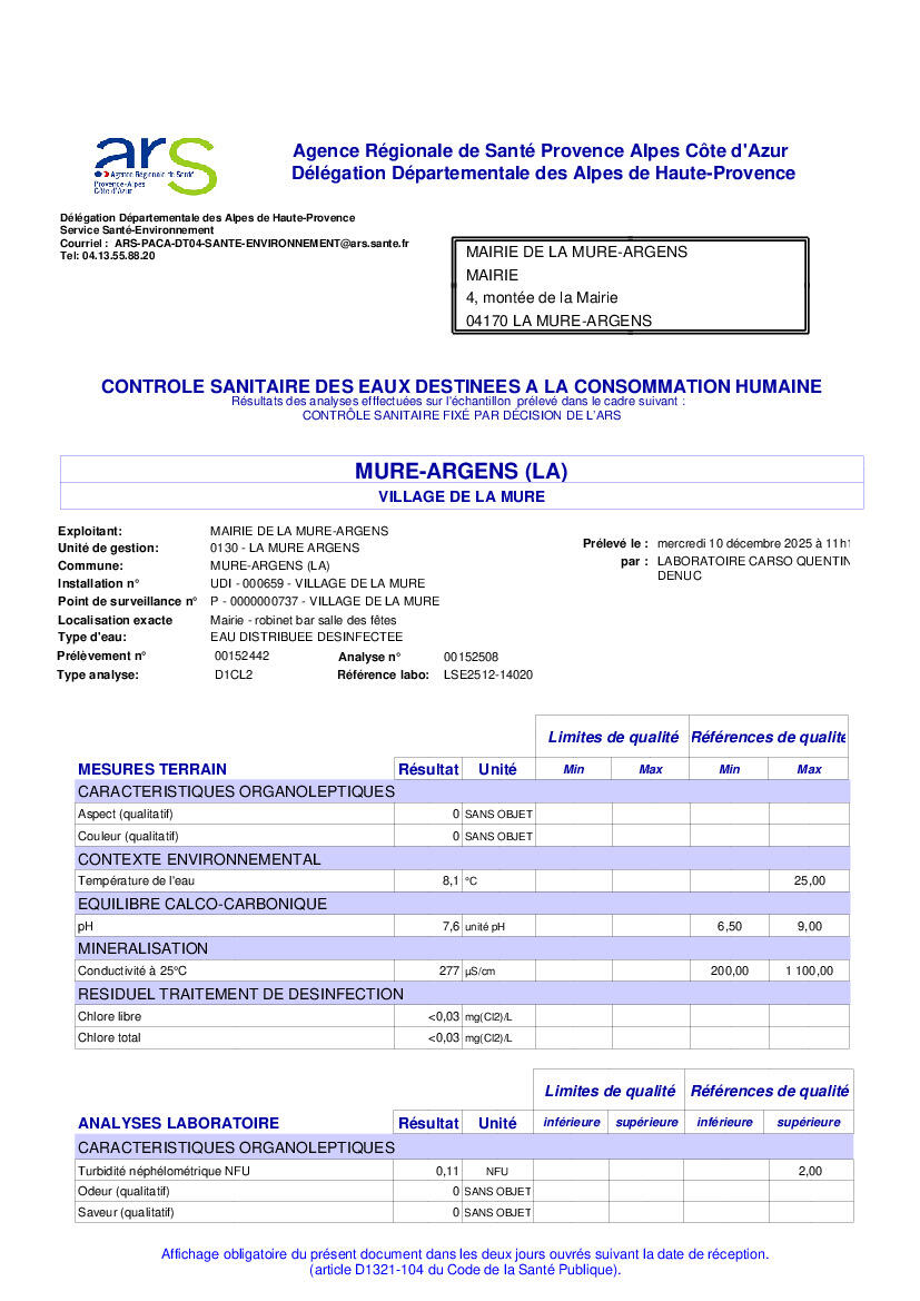 d'analyse(s) d'eau du contrôle sanitaire réglementaire prévu aux articles R.1321-15 à 22 du code de la santé publique.