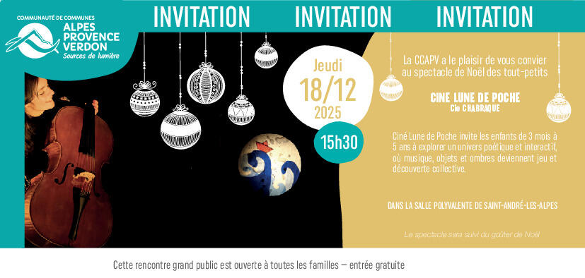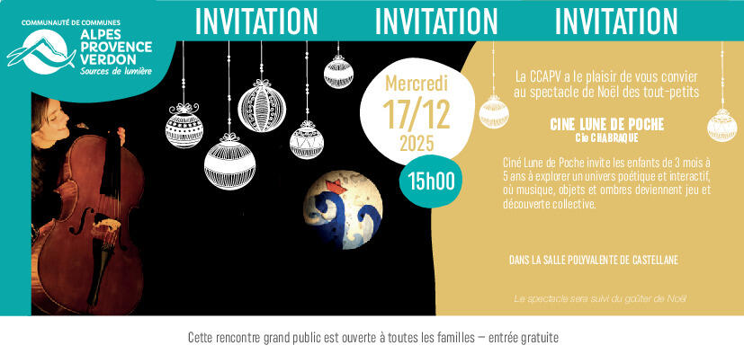 Vous trouverez en pj les cartons d’invitation aux spectacles de Noël Petite Enfance de la CCAPV