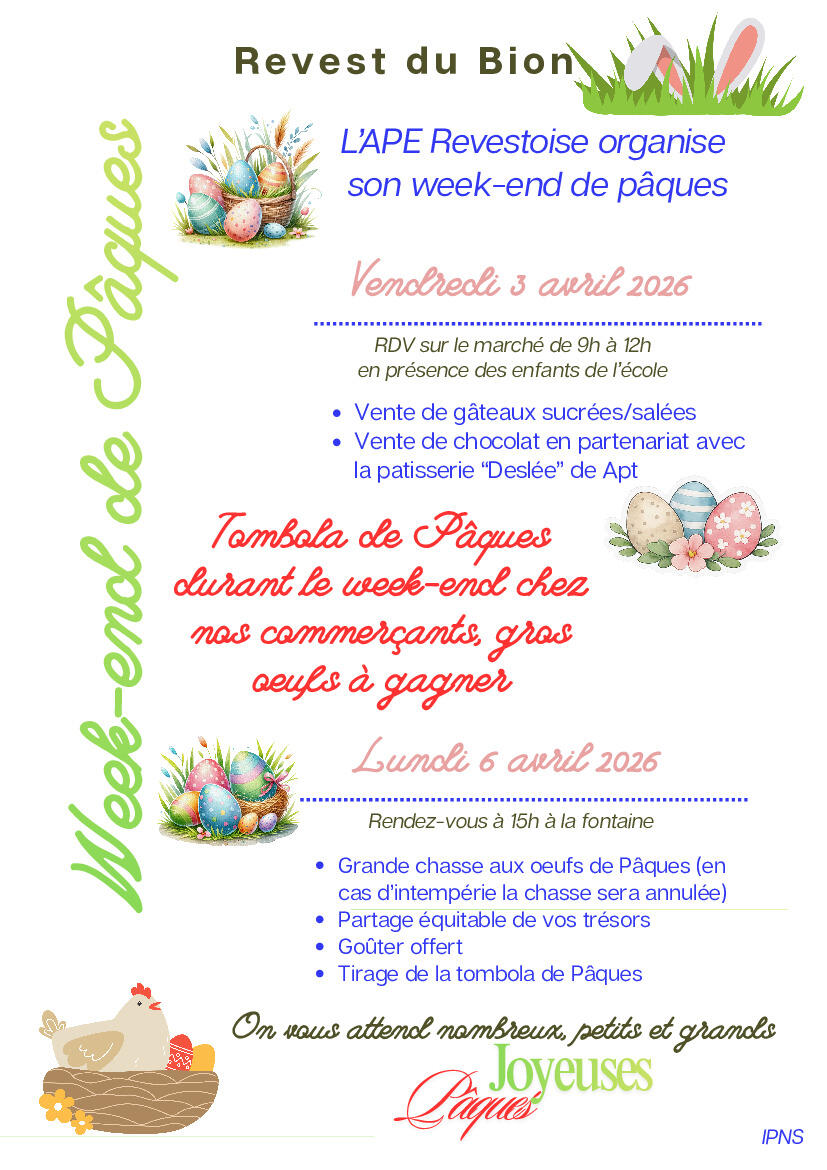 Durant tout le week-end, venez participer à la tombola de Pâques chez nos commerçants, de gros œufs en chocolat sont à gagner.