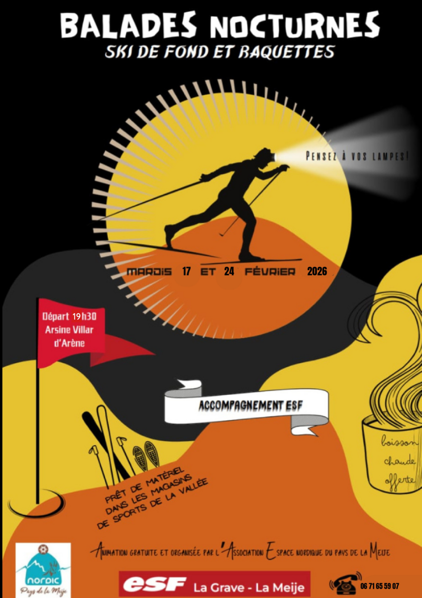 "Prenez vos lampes ! " Départ à 19h30 d'Arsine Villar d'Arène ; Accompagnement ESF ; Prêt de matériel dans les magasins de sports de la vallée ; Boisson chaude offerte ; Animation gratuite et organisée par l' Association Espace nordique du pays de la Meije
