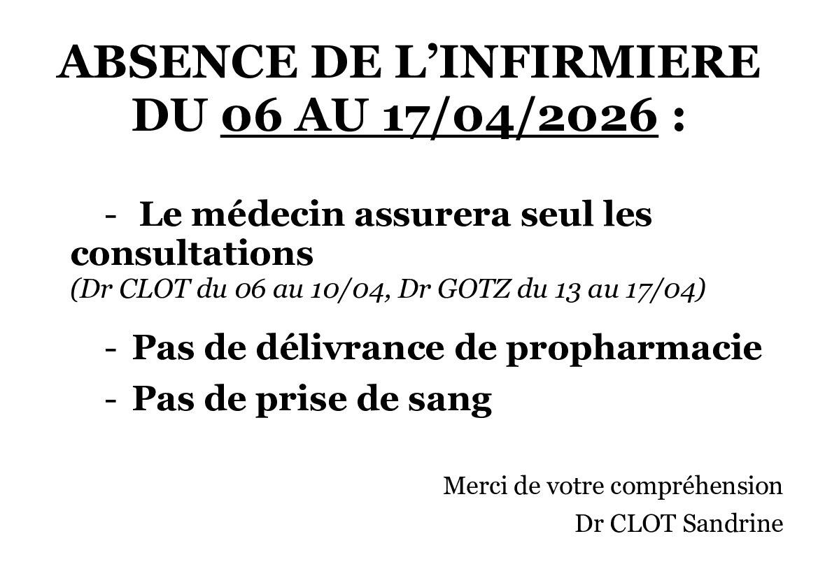 Cabinet Médical -Absence Infirmière Et Remplacement Dr Clot 02/04/2026 ABSENCE DE L’INFIRMIERE DU 06 AU 17/04/2026 : Le médecin assurera seul les consultations (Dr CLOT du 06 au 10/04, Dr GOTZ du 13 au 17/04) Pas de délivrance de propharmacie Pas de prise de sang Merci de votre compréhension Dr CLOT Sandrine