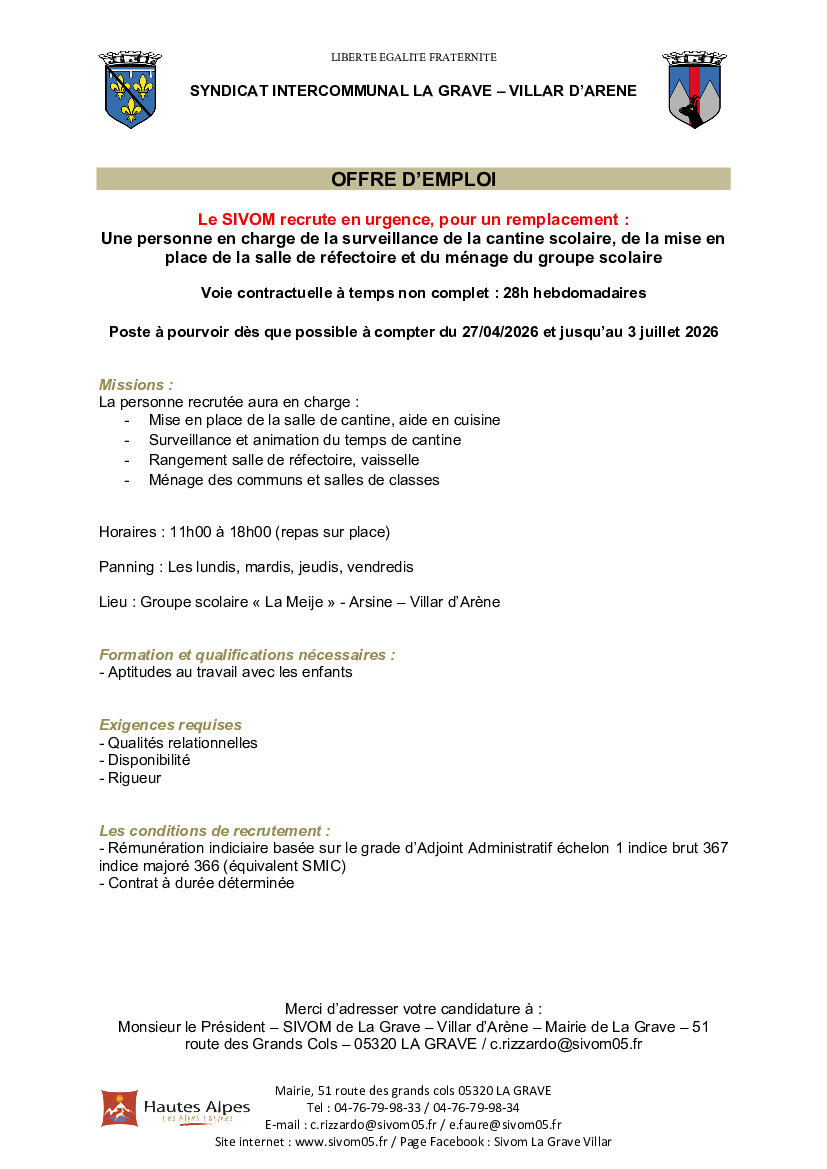 Offre D'emploi Sivom 23/04/2026 le SIVOM recrute en urgence, pour un remplacement : une personne en charge de la surveillance de la cantine, de la mise en place de la salle de réfectoire et du ménage du Groupe Scolaire.