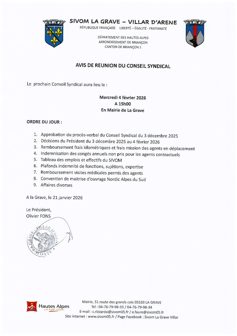 Réunion Du Conseil Syndical (Sivom) Le 04/02/2026 27/01/2026 Une réunion du conseil syndical du Sivom aura lieu le Mercredi 4 février 2026 à 15 h en Mairie de La Grave