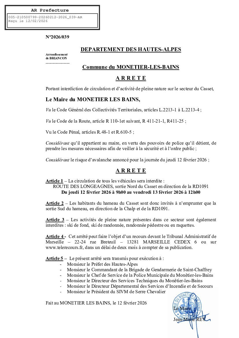 En raison du risque élevé d'avalanches, la route des Longeagnes (sortie Nord du Casset) est fermée jusqu'au vendredi 13 février à 12h.