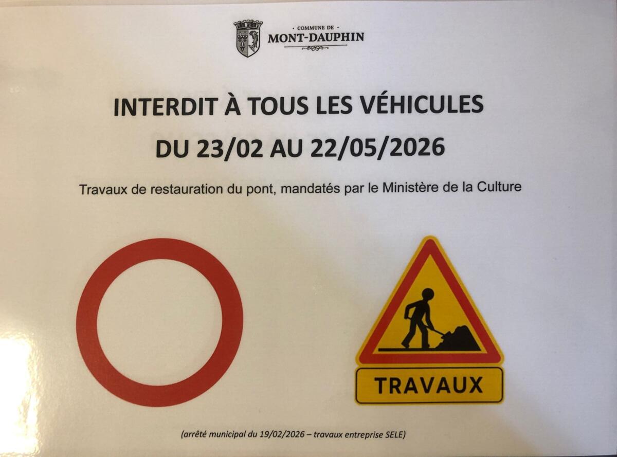 La route des rampes est fermée à la circulation jusqu’au 22 mai 2026 pour travaux à la porte d’embrun. Possibilité de passer en piéton et vélo via poterne.