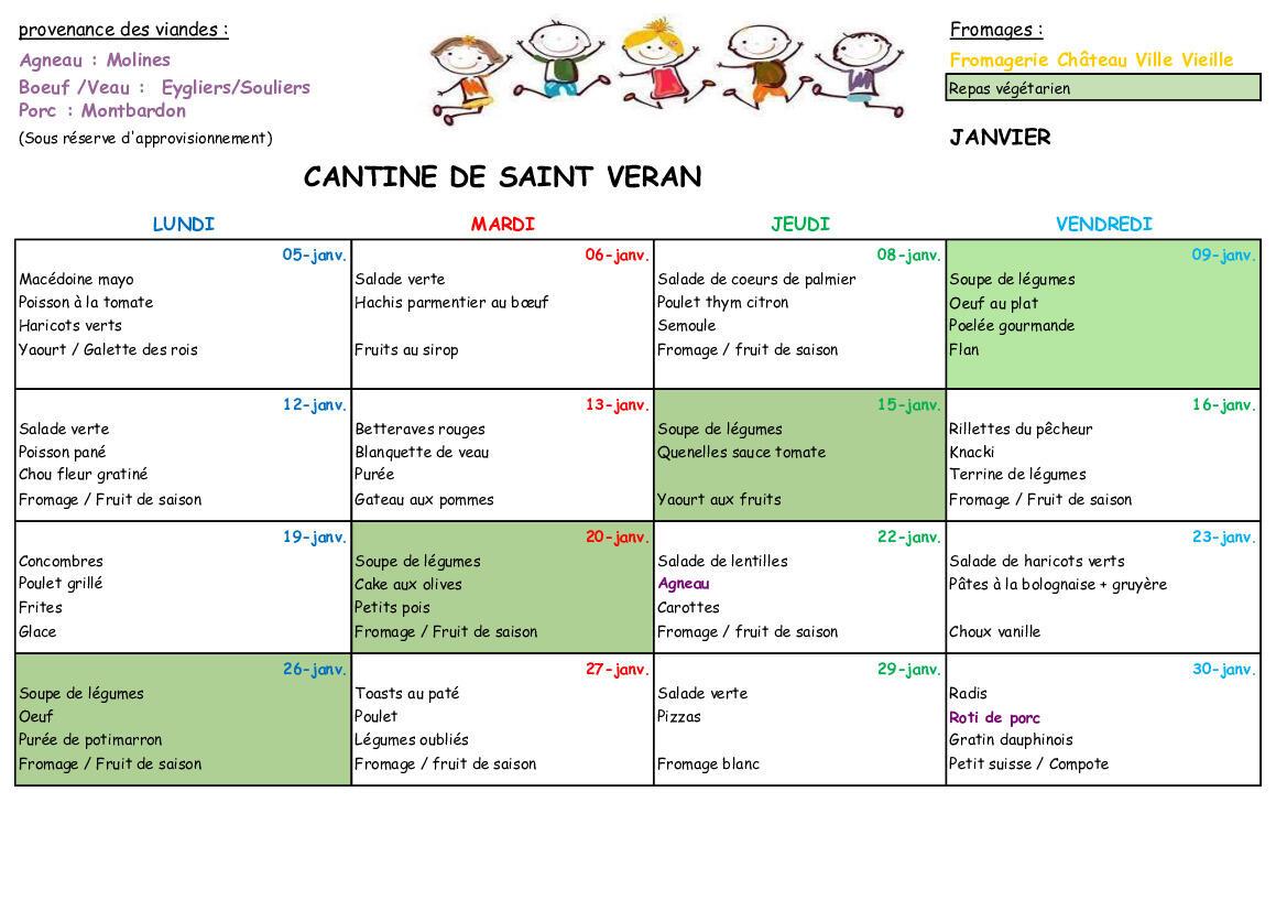 Menus du mois de janvier 2026 et liste allergènes