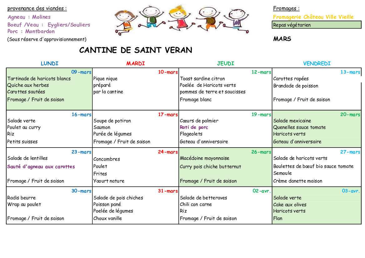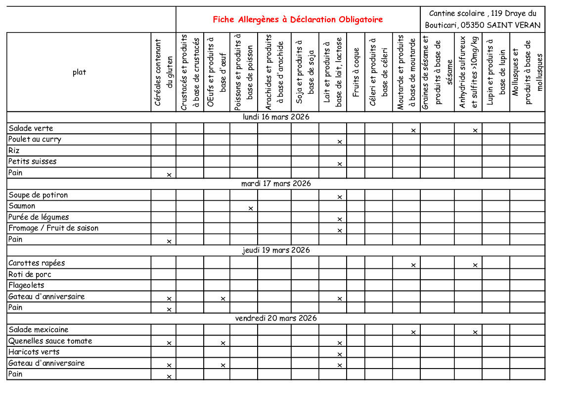 Menus du mois de mars 2026 et liste allergènes