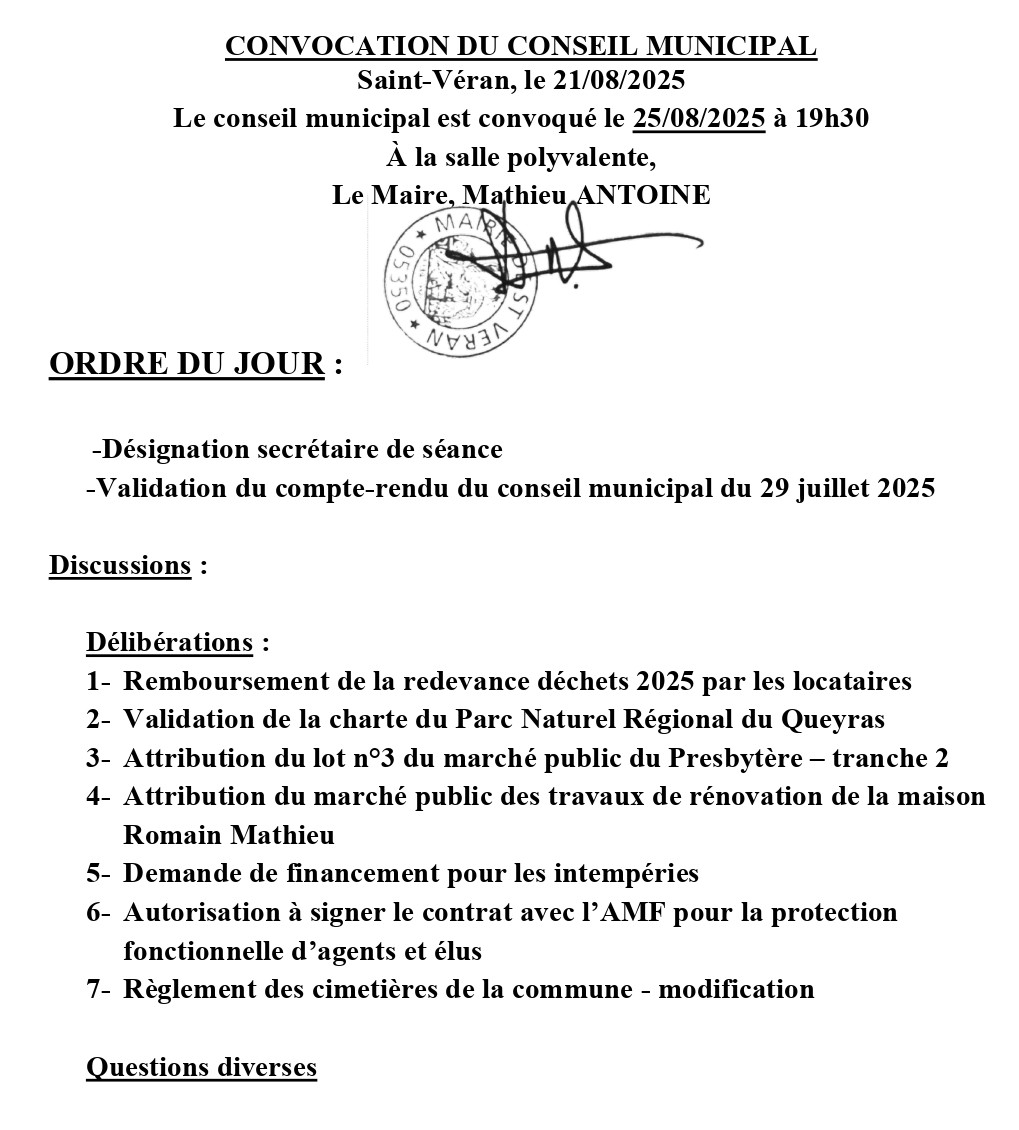 Prochain Conseil Municipal : ce lundi 25 août. 23/08/2025 Le prochain Conseil Municipal aura lieu ce lundi 25 août à 19h30 à la salle polyvalente.
