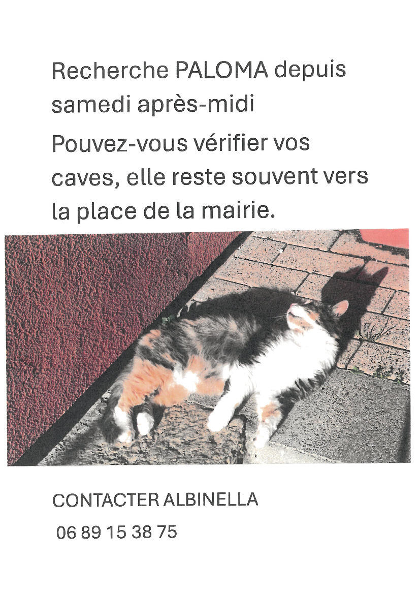 Paloma une chatte qui a pour habitude de rester au niveau de la place de la mairie à disparue depuis samedi après-midi