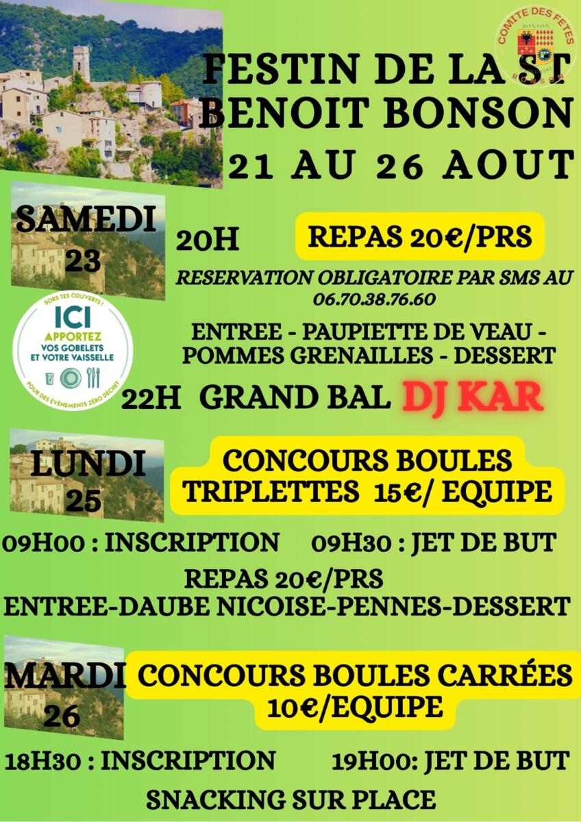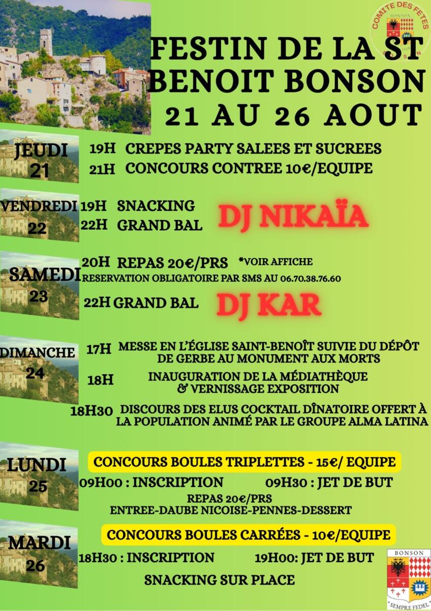 Festivités de la Fête patronale de la St Benoît 29/07/2025 Du 21 au 26 août 2025 (repas, concours, DJ...)