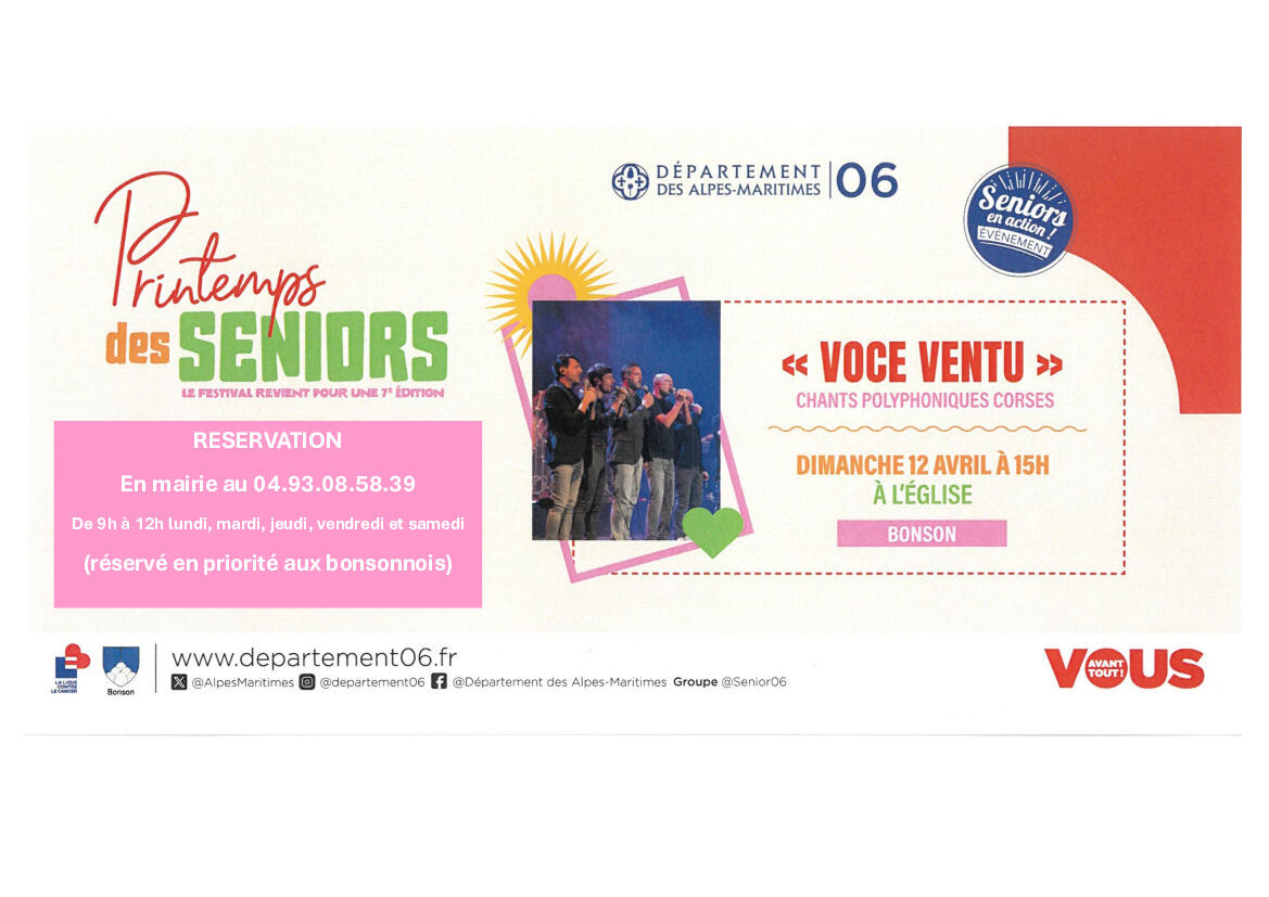 Printemps des Seniors 10/03/2026 Dimanche 12 avril à 15h "VOCE VENTU" A l'église de Bonson Réservation en mairie au 04.93.08.58.39