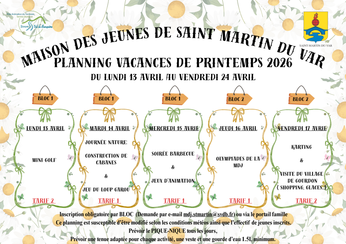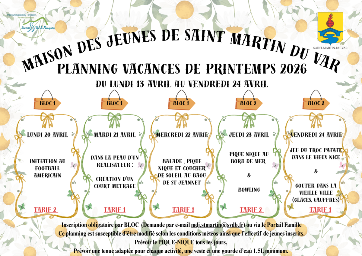 La Mairie et Le SIVOM ont le plaisir de vous présenter le programme des activités proposées aux jeunes de la Maison des Jeunes de Saint-Martin-du-Var 🌼