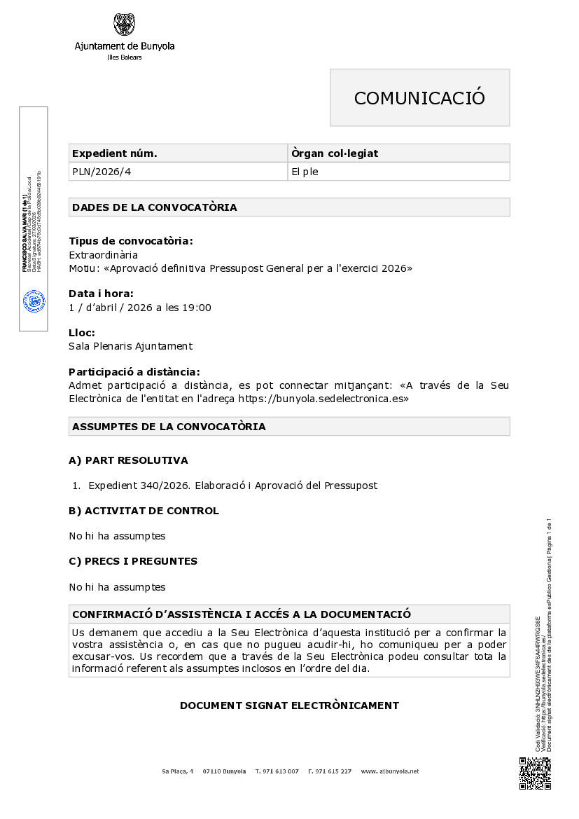 L'Ajuntament de Bunyola convoca una sessió plenària extraordinària per a l'aprovació definitiva dels pressupostos d'enguany. Aquí teniu els detalls principals: