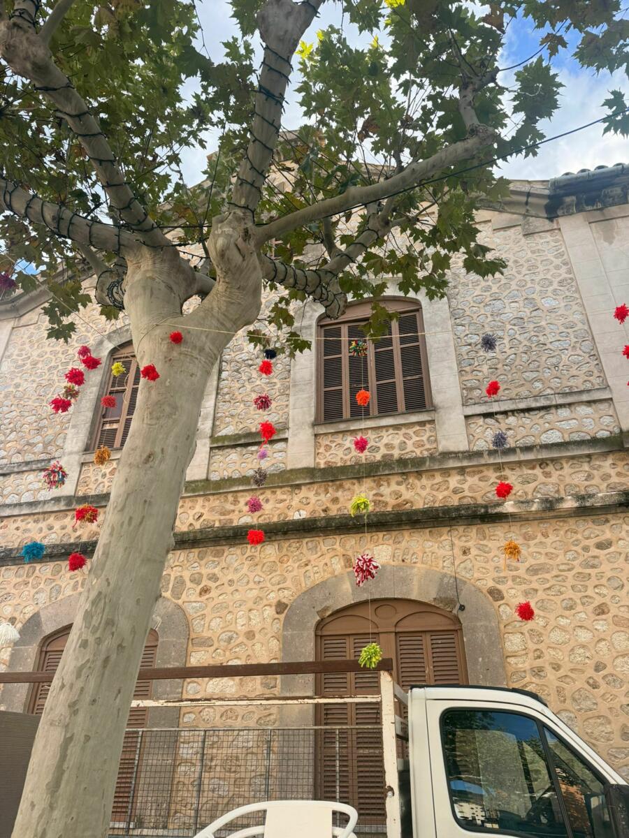 La brigada municipal ja està muntant la decoració de la plaça, elaborada pels alumnes del CEIP Mestre Colom 🧶