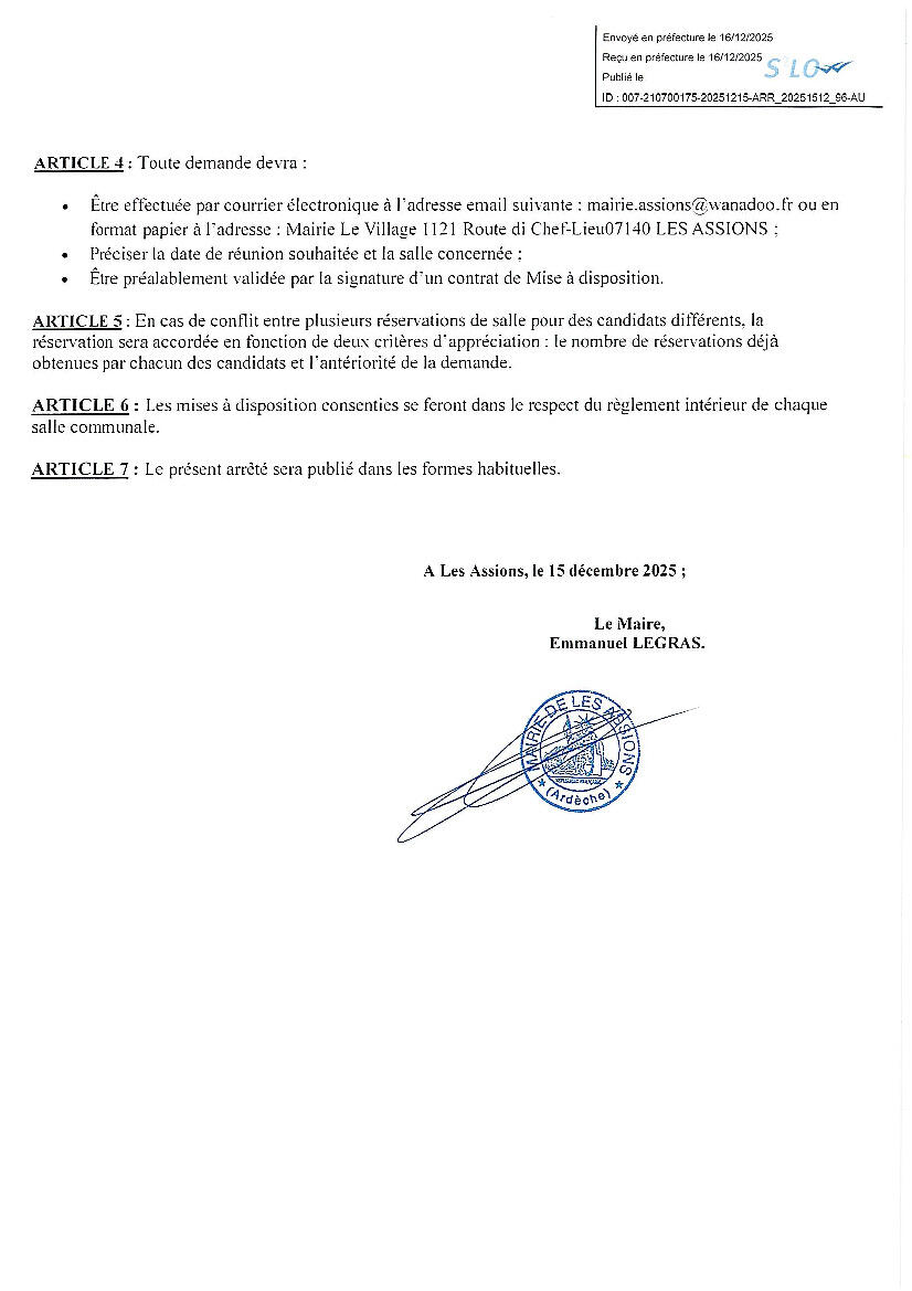 ARR 2025-96 16/12/2025 ARRÊTÉ RÉGLEMENTANT LA MISE A DISPOSITION DE SALLE COMMUNALE EN PÉRIODE ÉLECTORALE