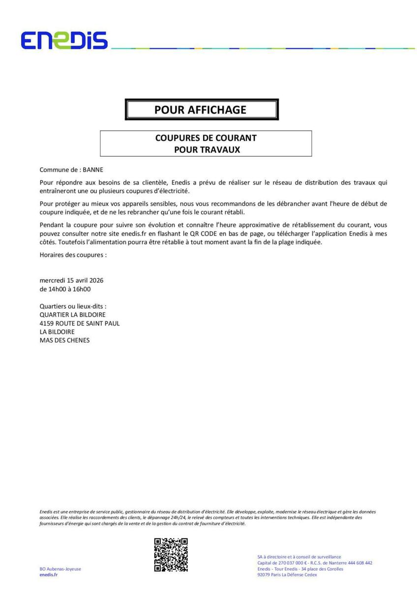 ENEDIS vous informe qu'ils sont conduits à programmer des travaux qui entraîneront une coupure d’électricité sur le territoire de notre commune : mercredi 15 avril 2026 entre 14h00 et 16h00.